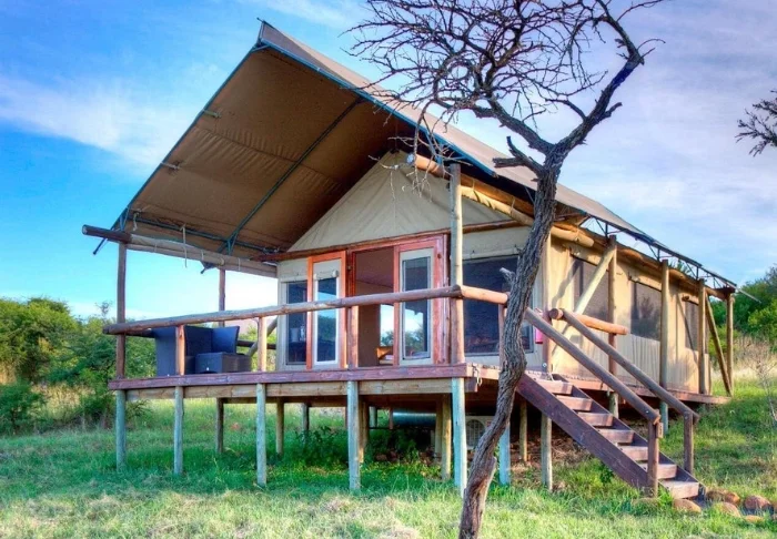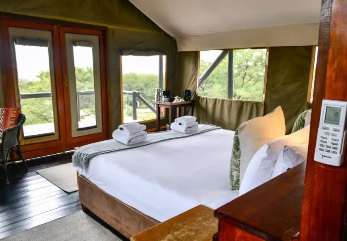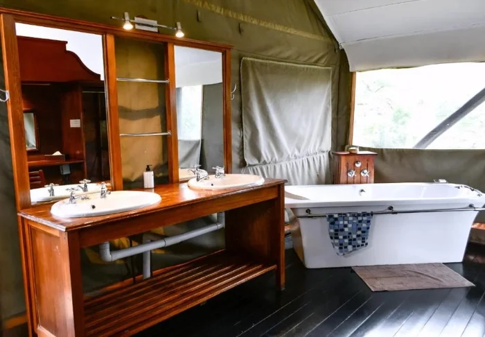 Du indlogeres i et elegant safaritelt, som med solide murstensvægge og kanvastag skaber en både hyggelig og rustik stemning, mens de store vinduer lukker naturen og lyset helt ind. Alle telte er rummelige og indrettet med moderne bekvemmeligheder samt privat veranda, hvor du kan nyde udsigten og bushens lyde i fred og ro.