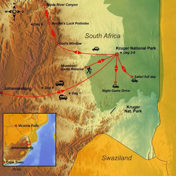 På denne rejse bor du på Kruger Gate Hotel lige ved grænsen til den verdensberømte Kruger Nationalpark. Du har mulighed for at komme tæt på The Big 5, og du lærer at afkode naturens signaler på en spændende bushwalk med en dygtig ranger. Du oplever Sydafrikas højeste og længste bjergkæde Drakensbjergene. I Drakensbjergene er der en spektakulær udsigt over et af turens højdepunkter Blyde River Canyon, der er verdens tredje største kløft. Du oplever også udsigtspunkterne God’s Window og Bourke’s Luck Potholes, hvor floderne Blyde og Treur har eroderet dybe, cylindriske formationer i klipperne.