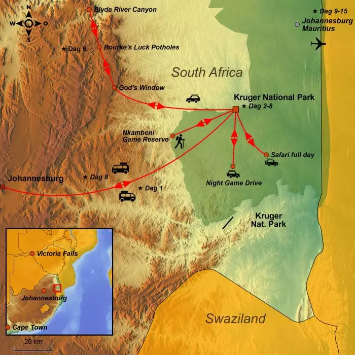 På denne rejse bor du på Kruger Gate Hotel, kun få hundrede meter fra gaten den verdensberømte Kruger Nationalpark. Du har mulighed for at komme tæt på The Big 5, og du lærer at afkode naturens signaler på en spændende bushwalk med en dygtig ranger.
