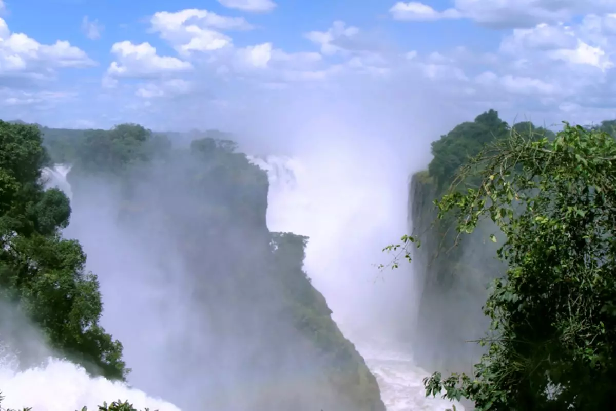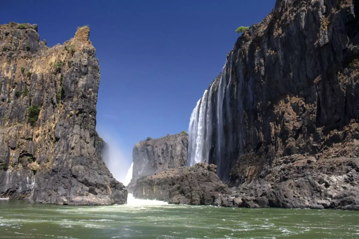 Tæt på er vandfaldene næsten uvirkelige. Over 1000 kubikmeter vand pr. sekund vælter ca. 100 meter ned i basalt slugterne i Batoka Gorge. Faldene er 1,7 km brede, og udgør grænsen mellem Zambia og Zimbabwe.