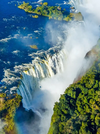 Ofte får du, allerede fra luften, det første kig til de mægtige Victoria Falls. Vandsprøjtene rejser sig flere hundrede meter op i luften over faldene, og du forstår med det samme, hvorfor de lokale kalder vandfaldene “Mosi-oa-Tunya” – røgen, som tordner. Det ligner vitterligt røg, men regnbuerne, som danser i solens stråler, forsikrer dig om, at det er vand.