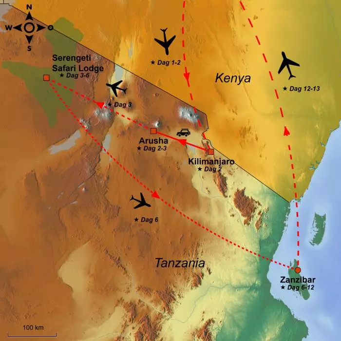 Hvis du er heldig, kan du fra luften få et glimt af Afrikas højeste bjerg, Kilimanjaro. Det rejser sig majestætisk hele 4.800 meter op fra savannen (5.895 m.o.h.), og der er altid sne på toppen.