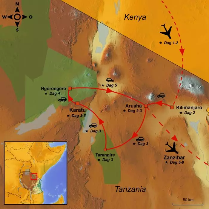 Efter denne lille smagsprøve på safarilivet i Tanzania er det tid til at vende snuden mod sol, strand og azurblåt vand. Fra Karatu kører du retur til Arusha, hvorfra du flyver til Zanzibar.