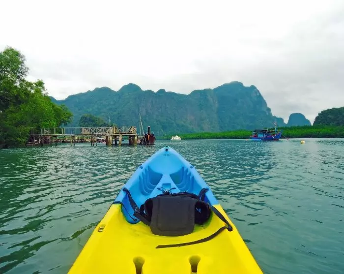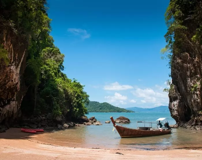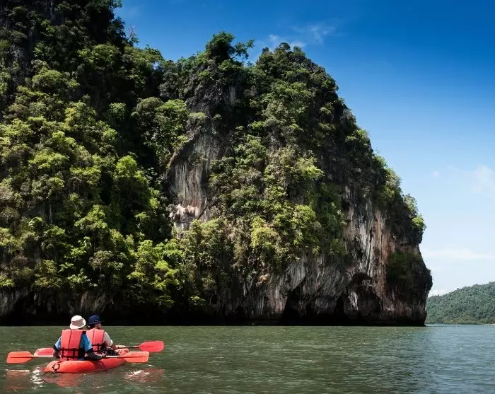 Videre med piskerisbåd besøger du øerne Koh Aung og Koh Talabeng med ikoniske kalkstensklipper og billedskønne bugter. Ved Koh Talabeng venter en uforglemmelig kajaktur rundt om øen, hvor du oplever dens uberørte natur, storslåede kalkstensklipper og fascinerende grotter.