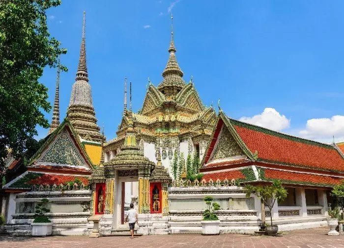 Herfra går I til turens første besøg, som er ved det utroligt smukke tempel Wat Pho, som er Bangkoks største og ældste. Wat Pho var oprindeligt Thailands første offentlige universitet og er tilmed en af de ældste thaimassageskoler i landet. Templet udgør et større kompleks af forskellige tempelbygninger samt et kloster med 300 munke. Templet er særligt kendt for sin gigantiske liggende guldbuddha, der er 46 meter lang og 15 meter høj. Buddhaen er lavet af gips og mursten og er efterfølgende dækket med bladguld. Templet har desuden den største samling af Buddha-statuer.
