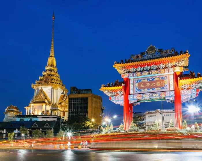 Herefter hopper du igen ombord i en tuktuk og suser gennem Chinatown, hvor neonlys og travle gader skaber en helt særlig atmosfære. Der gøres et kort stop ved den 27 meter høje Giant Swing, som er et historisk og kulturelt vartegn ved templet Wat Suthat Thepwararam og som er smukt oplyst om aftenen og oplagt til fotos.