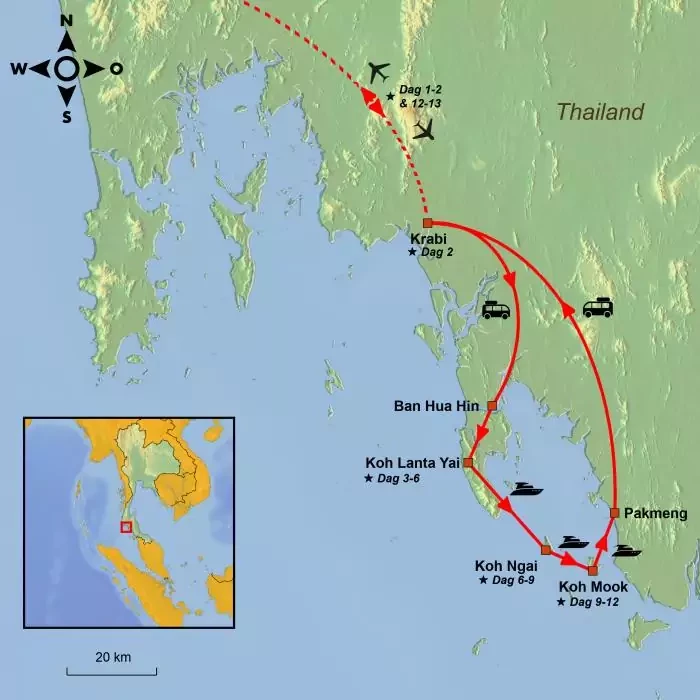 I løbet af denne rejse bor du på tre meget forskellige øer, der har hver deres charme; Koh Lanta, Koh Ngai og Koh Mook. Her venter fine hvide sandstrande, smukke betagende udsigter, høje lodrette bjerge, små lokale samfund samt hurtige speedbåde og traditionelle piskerisbåde, der fragter dig fra den ene ø til den anden.