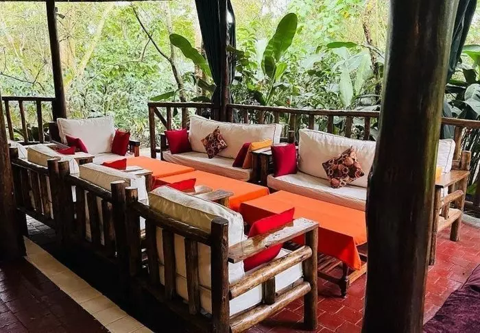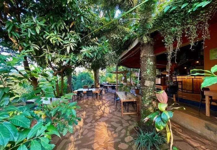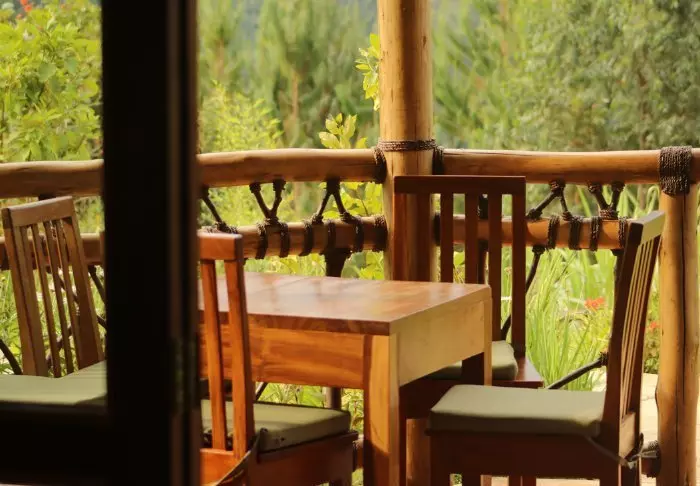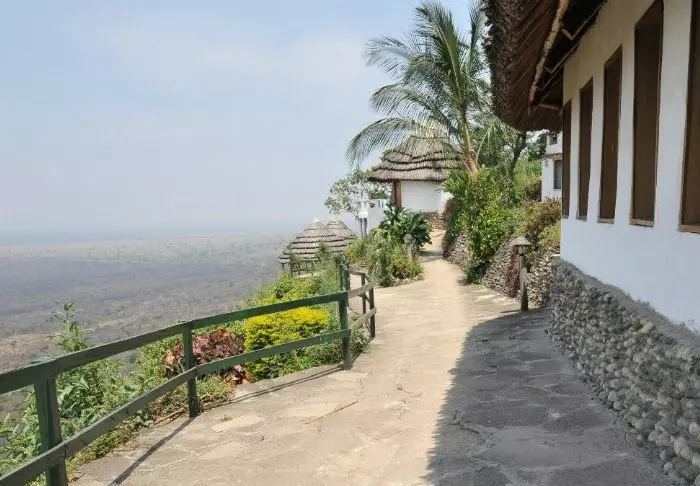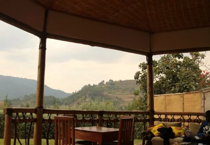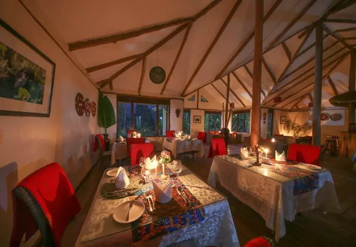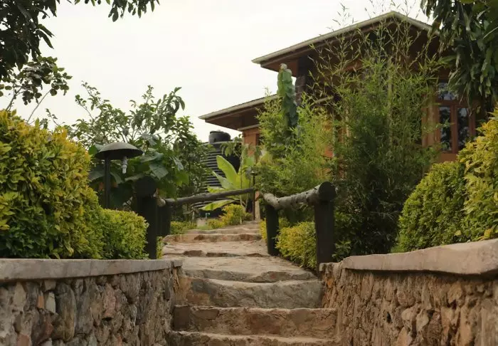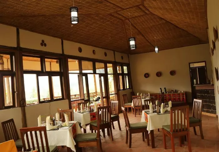 Hovedbygningen med restaurant, bar og loungeområde er placeret på toppen af skråningen og giver dig ikke blot en billedskøn udsigt, men også masser af ren, frisk luft fra skoven og dens mange træer, mens du får dig en bid mad. Fra hovedbygningen går en sti, som fører dig direkte til Rushaga-porten og ind i nationalparken.