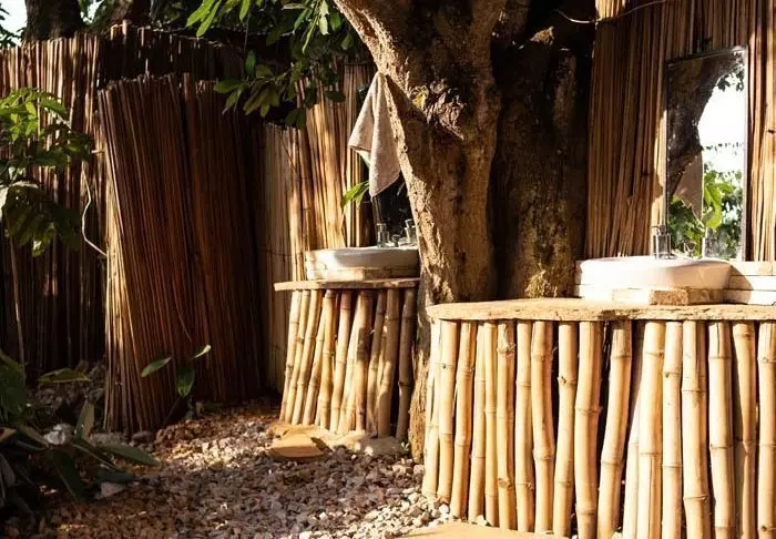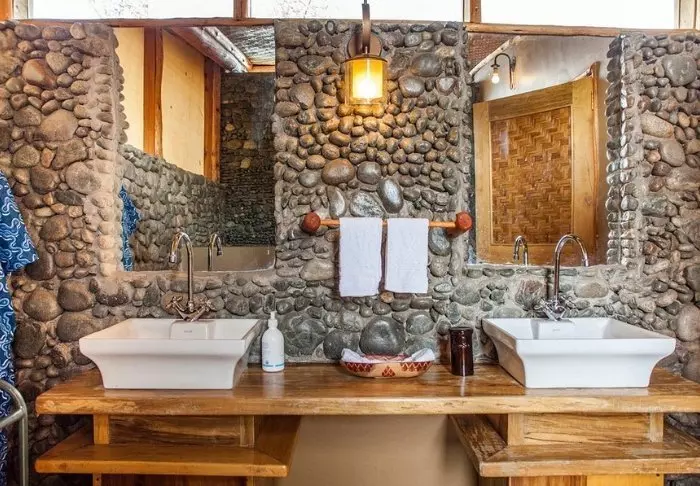 Selve lodgen er bygget af lokale håndværkere, der udelukkende har anvendt lokale materialer for at tilpasse sig omgivelserne. Desuden er størstedelen af møblerne og dekorationerne håndlavet af lokalbefolkningen.