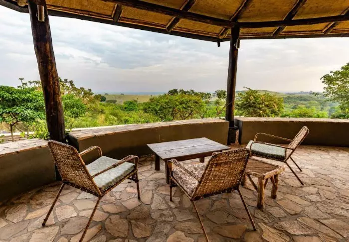 Den rustikke Kyambura Gorge Lodge ligger lige på grænsen til Queen Elizabeth Nationalpark på en af Kyambura Gorge-kløftens skrænter og har med sin beliggenhed en betagende udsigt over savannen og Kyambura Gorge, der i folkemunde også kaldes ”Valley of the Apes”.
