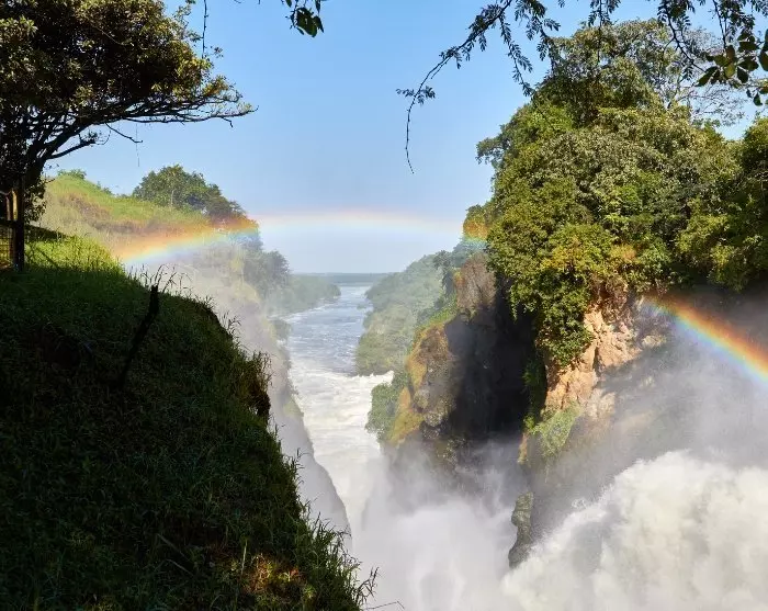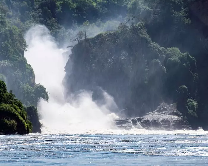 Et af de helt store højdepunkter i Murchison Falls er stedet, hvor den 500 meter brede (hvide) Nil brager gennem en kun 7 meter smal kløft, og vandet falder 45 meter ned i en lavereliggende flod. Vandet skummer, sprøjter og larmer vildt, og synet er en fantastisk påmindelse om naturens kræfter.