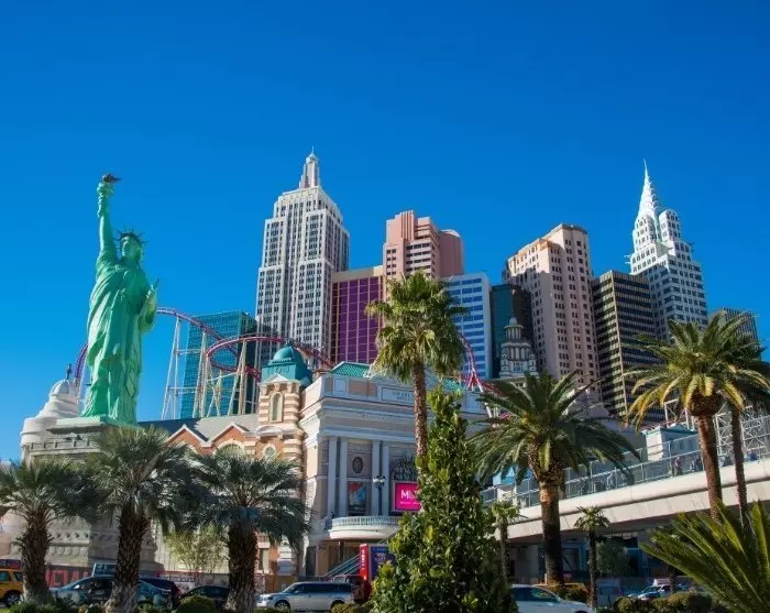 Du kan også vælge den direkte vej til ”Sin City”. Det er noget af en kontrast at komme fra dagevis med storslået natur, og så pludselig kunne ane skyhøje bygninger i horisonten. På den 6,8 km. lange Las Vegas Blvd., også kendt som The Strip, ligger temahotellerne som perler på en snor, og ankommer du her hen på aftenen, vil du se lysene fra hotellerne rejse sig som et fatamorgana i horisonten, længe før du er her.