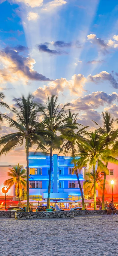 Du er ikke i tvivl om, hvornår du nærmer dig Miami, da de vidstrakte udsigter til havet afløses af bylandskab med høje huse, store biler og krydstogtskibe. Du skal bo i Miami Beach, der er kendt for sine farvestrålende huse opført i art deco-stil, strand og shopping langs den berømte gade, Collins Avenue.