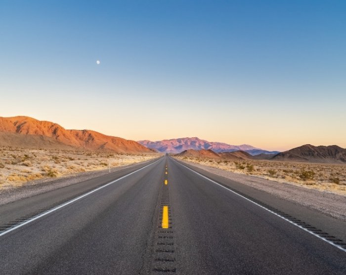 Mærk igen den enorme kontrast, når du forlader Los Angeles og drager mod Las Vegas. Her oplever du på kort tid byens skyskrabere forsvinde i bagruden og blive afløst af ørken, vindhekse over vejen, Diners og en forladt spøgelsesby.
