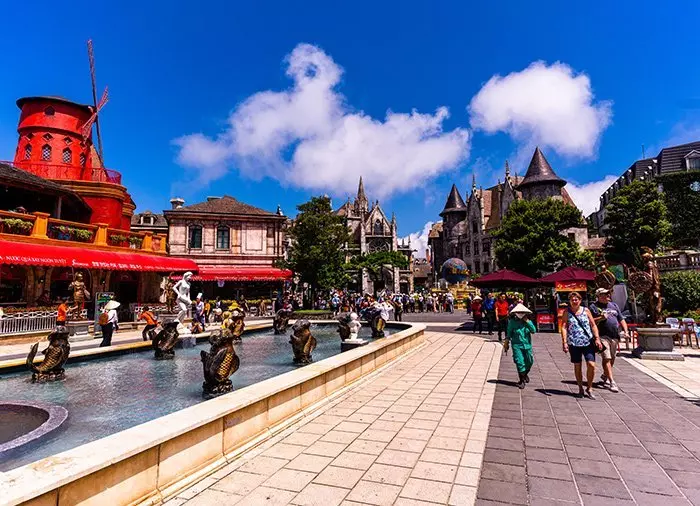 Guiden henter dig på hotellet fra morgenstunden og efter ca. 1,5 times køretur ankommer du til kabelbanen, der tager dig på en meget smuk 15-minutters tur op i 1400 meters højde. Et imponerende syn møder dig på toppen, hvor den gyldne bro pludselig dukker op svævende på 2 store hænder hugget i sten. Broen stod færdig i 2018 og er hurtigt blevet verdenskendt for dens spektakulære udformning midt i et magisk bjergområde og designet således, at det skal ligne, at Guds hænder løfter et stykke af jorden op til sig, som et fortov i himlen. Området på kabelbanens mellemstation blev oprindeligt etableret i 1919 af den franske kolonimagt bl.a. til at opbevaring af vin på grund af de køligere temperaturer, der typisk ligger 10 grader under temperaturen nede ved kysten. Her bliver der tid til at gå rundt i de smukke og farverige blomsterhaver også kaldet ”Le Jardin d’Amour”, Kærlighedens Have, hvor også en gigantisk hvid Buddha skuer ud over bjergkanten og de frodige bakker. Videre med kabelbanen op til toppen af bjerget bliver du budt velkommen af slotstårne. Du befinder dig nu i hjertet af parken og et eventyrligt landskab over forskellige skiftende temaer åbner sig for dig med f.eks. karneval i Rio, en fransk landsby, et japansk tehus og meget mere. Her har du fri adgang til de fleste forlystelser for både børn og voksne. Efter en dejlig frokost kan du på egen hånd springe ud i forlystelserne, bare gå rundt og nyde omgivelserne, købe lidt souvenirs eller tage et hvil på en af de mange caféer og restauranter eller i et roligt hjørne af parken som ved f.eks. Linh Ung-pagoden.