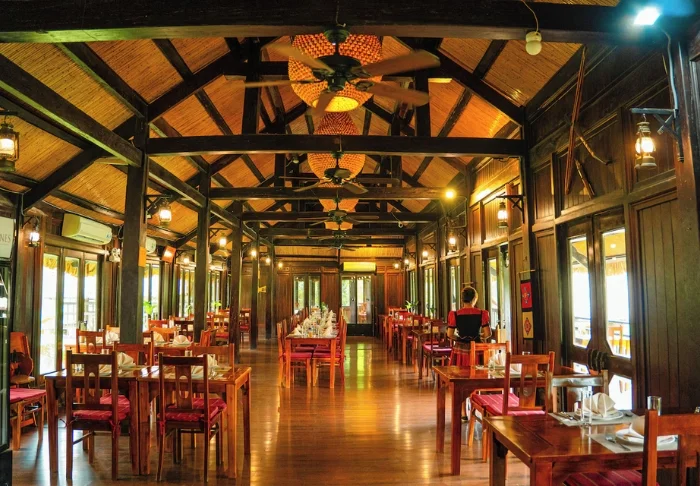 Restauranten ombord byder på vietnamesiske retter lavet af lokale råvarer og krydret med eksotiske smage. Maden serveres i en hyggelig træindretning, der skaber en romantisk stemning.
