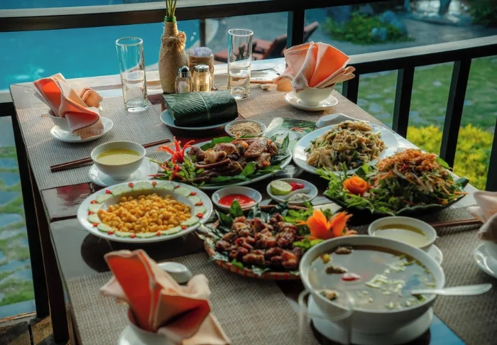 Restaurantens menukort er baseret på lokale råvarer fra området og byder på traditionelle vietnamesiske retter med friske urter, fisk og frugt fra deltaet. Mange af ingredienserne kommer direkte fra hotellets egen have, og maden kan nydes med udsigt til floden, hvor solen langsomt går ned bag palmerne.
