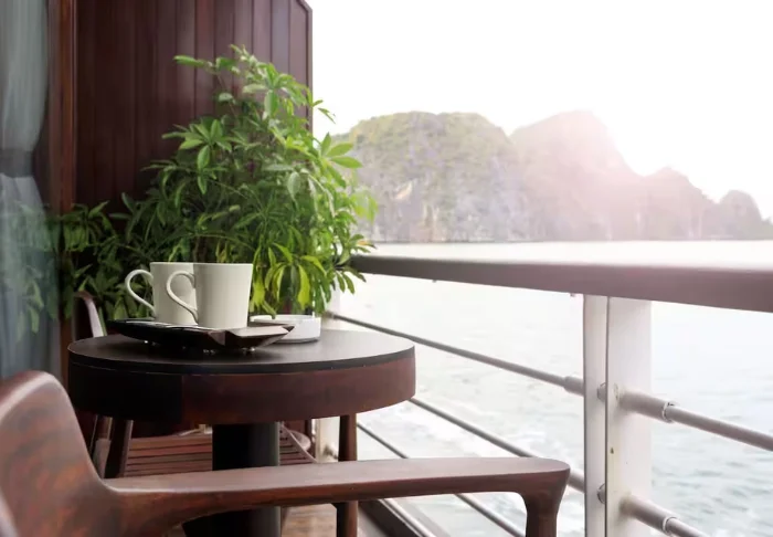 Skibet har 20 kahytter, hvilket skaber en rolig og intim stemning ombord. Du bor som standard i en Deluxe Balcony-kahyt på ca. 28 m² med privat balkon og udsigt direkte over bugten. Kahytten er indrettet i lyse nuancer med mørke trædetaljer og et separat siddeområde, der giver plads til afslapning. De store vinduespartier lukker lyset ind og gør landskabet til en naturlig del af rummet, uanset om dagen begynder med blødt morgenlys eller slutter i aftensolen. Kahytten har enten dobbeltseng eller to enkeltsenge, aircondition, wi-fi, minibar og værdiboks. Badeværelset er rummeligt og udstyret med både badekar og separat brusekabine samt badekåber, hjemmesko og toiletartikler.