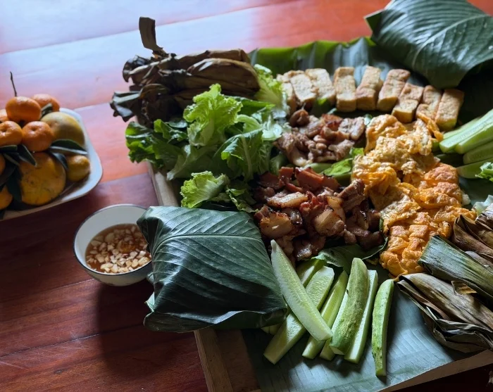 Efter sejlturen besøger du et lokalt landsbyhus, hvor du sammen med værterne er med til at tilberede traditionelle retter. Frokosten serveres ved et veldækket bord med lokale specialiteter, som nydes i fællesskab og giver et autentisk indblik i områdets madkultur. Der er også tid til at snakke med værterne og lære mere om Muong-folkets hverdag, kultur og traditioner.