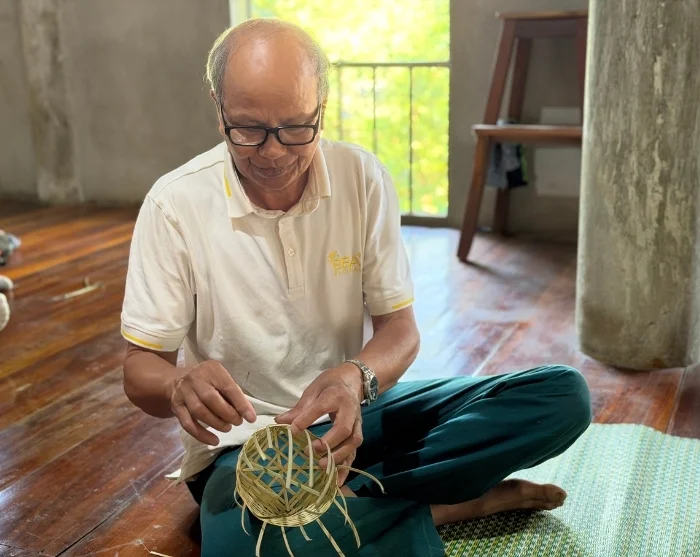 Dernæst besøger du et ældre ægtepar og får et indblik i Muong-folkets gamle håndværkstraditioner med vævning og bambusflet, som er blevet videregivet gennem generationer. Bambusarten luong bruges blandt andet til at fremstille kurve, fiskefælder og måtter. Hvert mønster og hver teknik afspejler en del af Muong-folkets kulturarv, og produkterne fungerer både som bæredygtige alternativer til moderne materialer og som unikke souvenirs. Du får selv mulighed for at prøve kræfter med håndværket og fletter din egen lille kurv, som du kan tage med hjem.