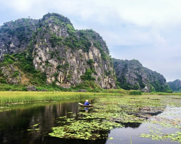 Herefter går rejsen videre til Ninh Binh, ofte kaldet “Ha Long Bay på land”. Du cykler gennem det frodige landskab til naturreservatet Van Long, tilbereder frokost sammen med en lokal familie og fortsætter med en stille sejltur i sampanbåd gennem Trang An-grotterne og forbi de knejsende kalkstensklipper.