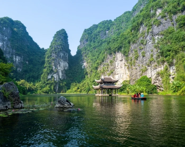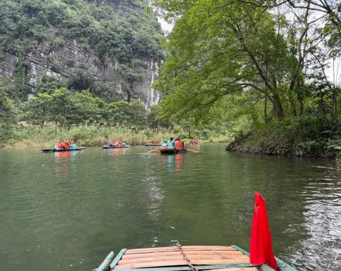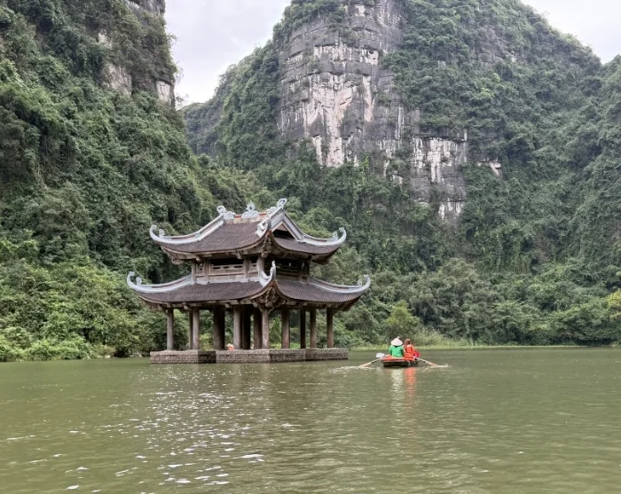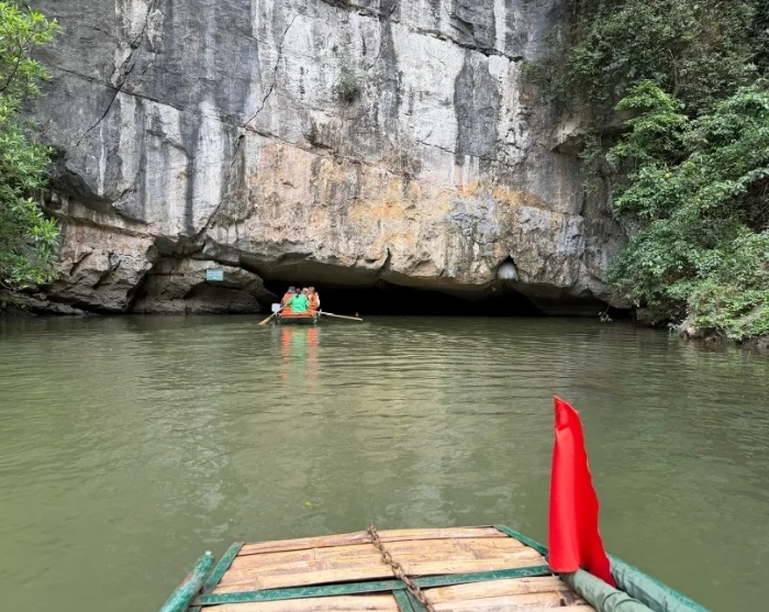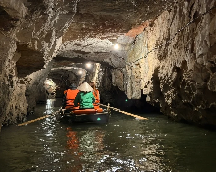 Herefter cykler du tilbage til startstedet. Turen tager blot få minutter. Her stiller du cyklen, hvorefter du bliver kørt til Trang An-grotterne, som er et spektakulært naturområde med dramatiske klippeformationer og skjulte huler. Du stiger ombord i en traditionel sampan, som roes stille ad den rolige flod gennem et netværk af grotter og huler, herunder Lam Cave, Vang Cave, Dai Cave og Thanh Truot Cave. Undervejs passerer du også templerne Cao Son, Suoi Tien og Vu Lam samt Skull Island, som blev brugt som optagelsessted for filmen “Kong: Skull Island” i 2017.