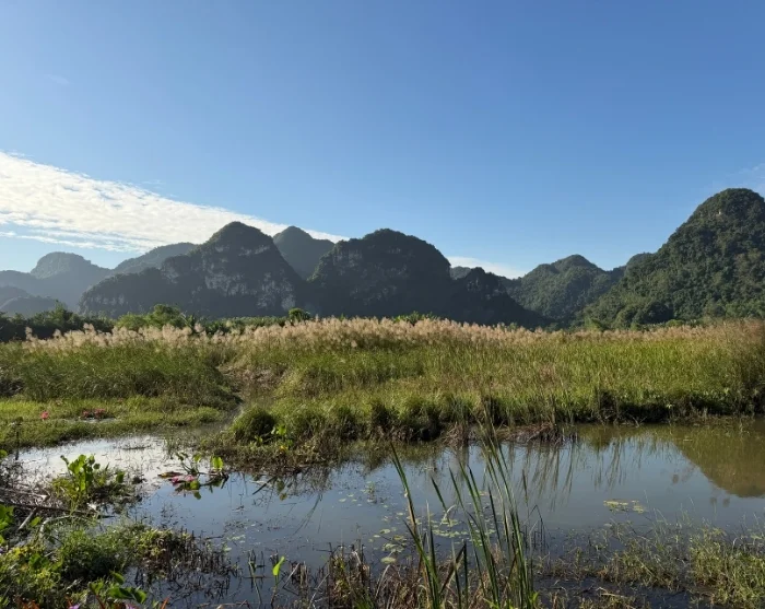 Efter morgenmaden kører du mod Gia Vien-distriktet, hvor dagens cykeltur på ca. 14 km begynder. Her sætter du dig i sadlen og cykler i roligt tempo ad små veje forbi grønne rismarker og lokale landsbyer på vej mod Van Long-naturreservatet. Undervejs er der tid til fotostop, blandt andet ved en lokal katolsk kirke, inden ruten fortsætter gennem det åbne landskab. Området omkring Van Long er kendt for sine rolige vådområder, markante kalkstensklipper og et rigt fugleliv, som danner en smuk ramme om turen.