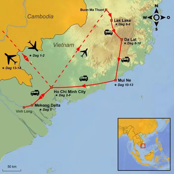 I dag forlader du Da Lat og begiver dig mod kystbyen Mui Ne – en køretur på ca. 4-4,5 time. Turen fører dig gennem smukke bjerglandskaber, hvor grønne dale, kaffeplantager og små landsbyer præger udsigten, inden vejen langsomt ændrer karakter, og du nærmer dig kysten med dens varme klima og solrige strande.
