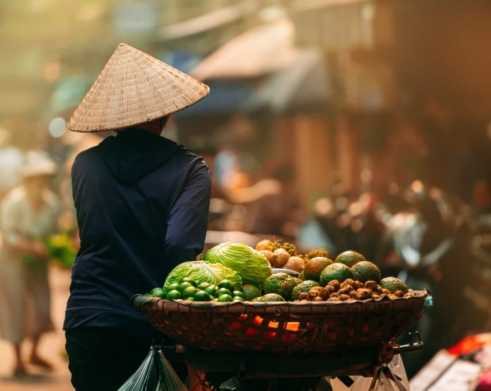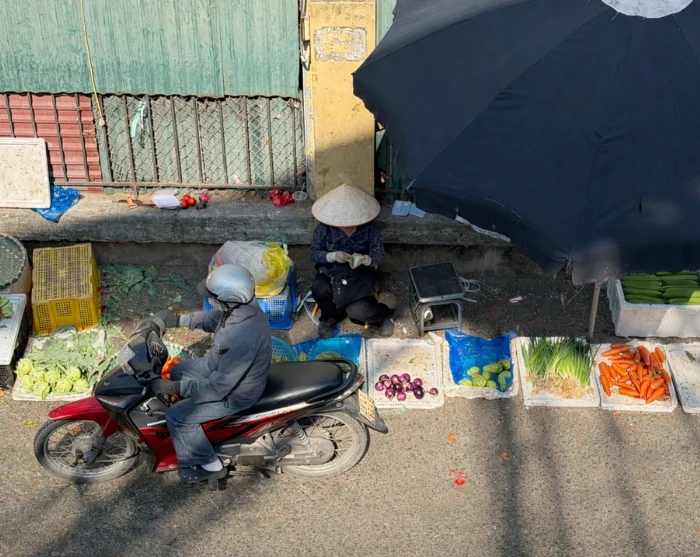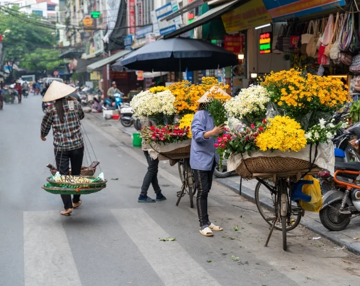 Herefter kan du fortsætte mod området ved Long Bien-broen og det nærliggende Long Bien-marked, hvor handlen med frugt, grønt og blomster fylder gaderne og giver et levende indblik i byens hverdagsliv. Her er tempoet højt og stemningen autentisk, uanset tidspunkt på dagen.