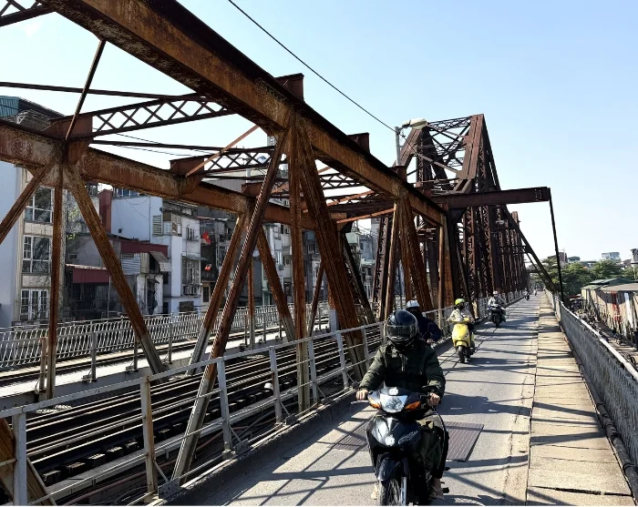 Efter en spændende cyclotur besøger du den historiske Long Bien-bro, som er et ikonisk vartegn fra den franske kolonitid, opført i begyndelsen af 1900-tallet. Den karakteristiske jernbro strækker sig over Den Røde Flod og blev hårdt beskadiget under Vietnam-krigen, men står i dag som et stærkt symbol på Hanois modstandskraft og historie. På broen får du et levende indblik i hverdagslivet i Hanoi med lokale, der kører på scooter til og fra arbejde side om side med cyklister og fodgængere. Kigger du ned fra broen, ser du det travle Long Bien Marked, hvor der er aktivitet fra tidlig morgen, mens udsigten over floden skaber en rolig kontrast til byens puls. Broen er et populært motiv for fotografer og rejsende, der ønsker at indfange Hanois sjæl.