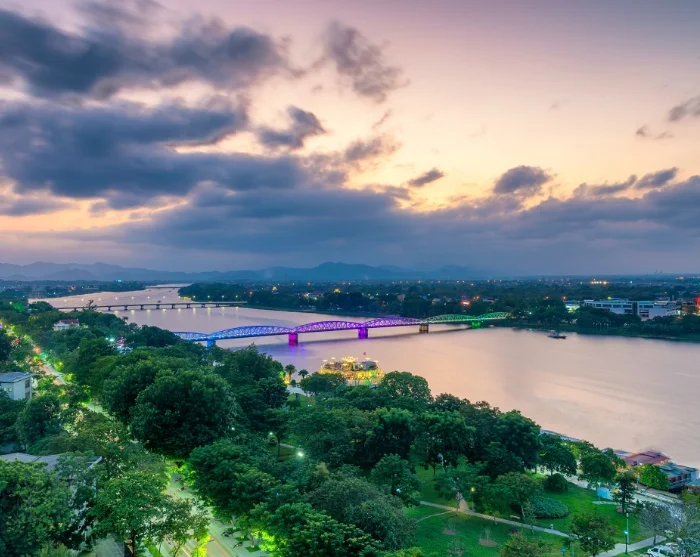 Hué byder på flere hyggelige muligheder om aftenen. Gå fx en tur langs Parfume-floden, hvor promenaden er stemningsfuldt oplyst, og du kan se de små både sejle forbi i mørket. Her ligger også små caféer og gadekøkkener, hvor du kan smage lokale specialiteter som Bun bo Hué, som er en lokal, krydret nudelsuppe.