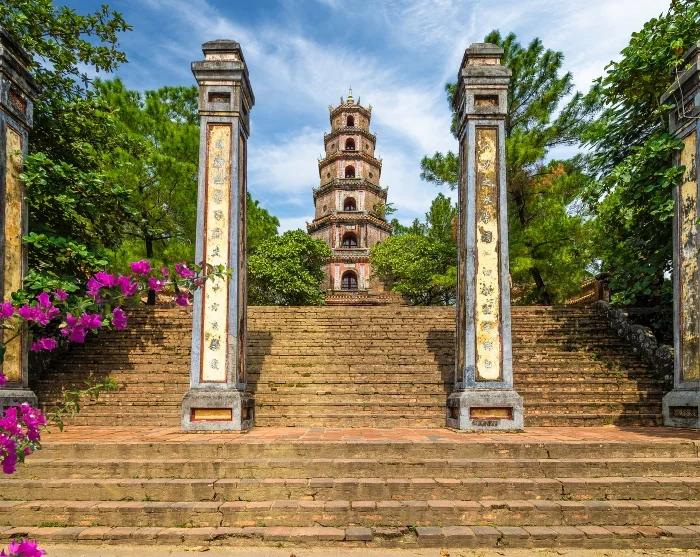 Dagens oplevelser fortsætter med en stemningsfuld sejltur på Parfume-floden, hvor du stille glider gennem landskabet mod Thien Mu-pagoden. Pagoden er Hués ældste og mest ikoniske religiøse vartegn og har i mere end 400 år været et vigtigt centrum for buddhismen i det centrale Vietnam. Det ottekantede pagodetårn rejser sig majestætisk mod himlen og danner en fredfyldt ramme om templet og det munkesamfund, der stadig lever og praktiserer her.