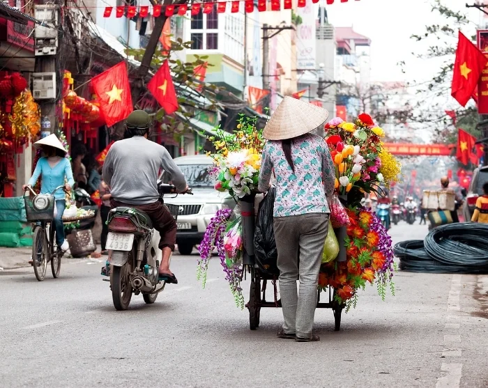 Herefter kan du fortsætte mod området ved Long Bien-broen og det nærliggende Long Bien-marked, hvor handlen med frugt, grønt og blomster fylder gaderne og giver et levende indblik i byens hverdagsliv. Her er tempoet højt og stemningen autentisk, uanset tidspunkt på dagen.