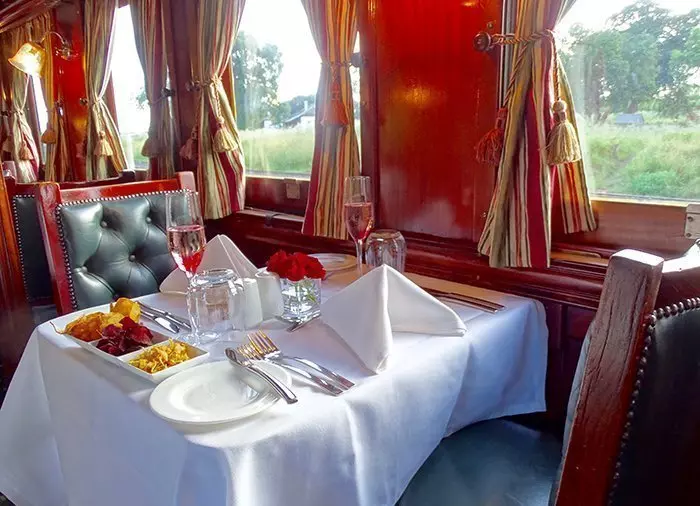 Efter stoppet på broen kører togene retur mod enten Zambia eller Zimbabwe, og det er tid for dig at finde den elegante spisevogn. Her serveres en 5-retters menu med tilhørende vine.
