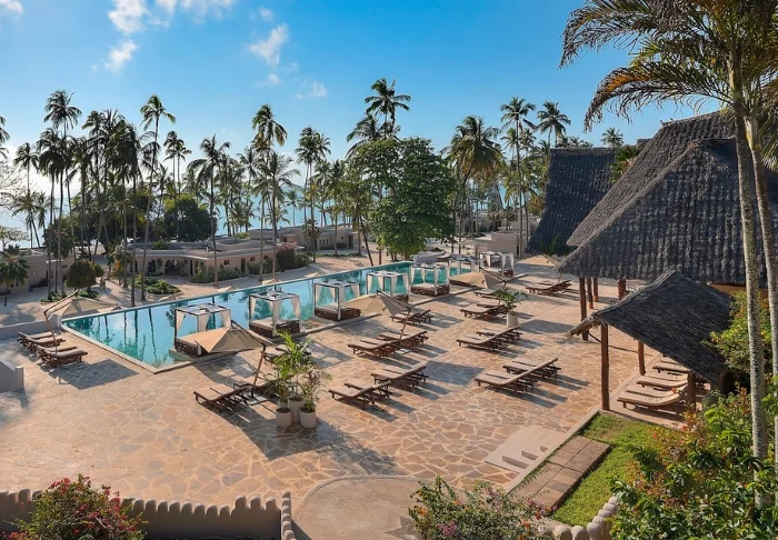 Det familieejede hotel er indrettet i klassisk Zanzibar-stil med et moderne tvist, har egen strand og er nærmest placeret i en stor botanisk have med mere end 3000 eksotiske planter, træer og blomster.