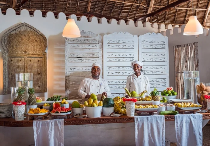 Hotellets to restauranter ligger med flot udsigt til stranden og det turkisblå hav. Her kan du nyde god mad og drikke sammen med en fantastisk udsigt over Det Indiske Ocean. Den ene restaurant serverer lette asiatisk-inspirerede retter såvel som klassisk cafe-mad, mens hovedrestauranten tilbyder en spændende menu med nyfortolkninger af det afrikanske og europæiske køkken, samt alt godt fra havet. På øverste etage serveres cocktails – det er det perfekte sted at nyde solnedgangen. Det er også her på toppen af hotellet, at du finder yoga-centeret.