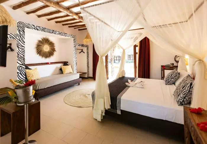 Det femstjernede Karafuu har en fremragende placering midt på stranden på Zanzibars østkyst. Hotellet består af 135 værelser i forskellige kategorier, så her er noget for enhver smag. Alle værelser har naturligvis aircondition, minibar, sikkerhedsboks samt te- og kaffefaciliteter.