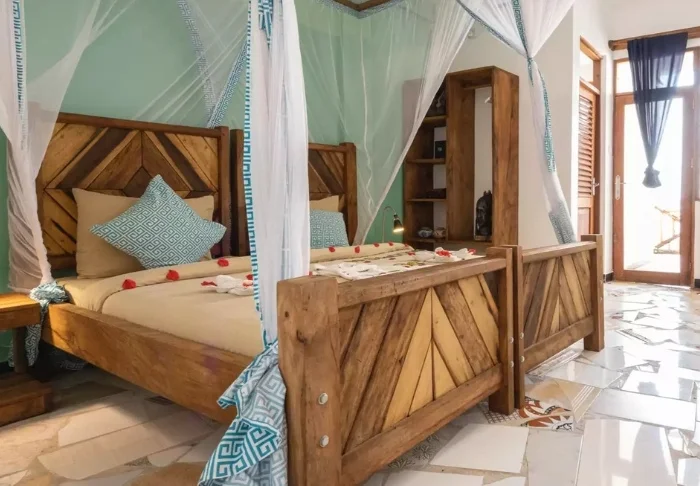 Her er 96 værelser, som alle har myggenet, aircondition, værdiboks, terrasse samt gratis Wi-Fi. De er indrettet i traditionel Zanzibar-stil med farverige puder og lokal kunst på væggene.